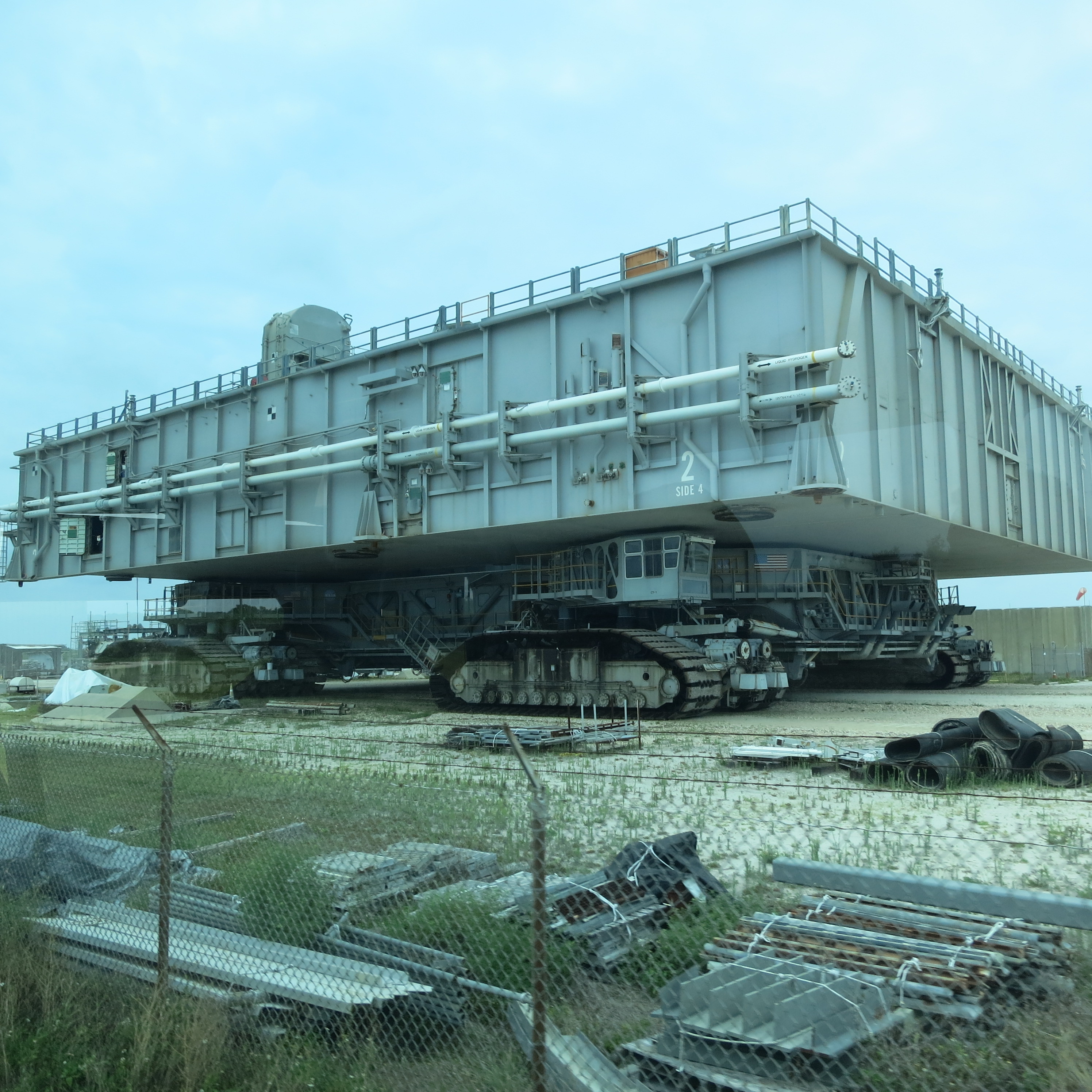 The “Crawler” at Kennedy Space Center with a platform on top. Rockets are transported on top of this from the assembly to the launch. Empty it weighs about 6 million pounds, can travel up to 2 mph, and takes a team of 30 to operate it.
