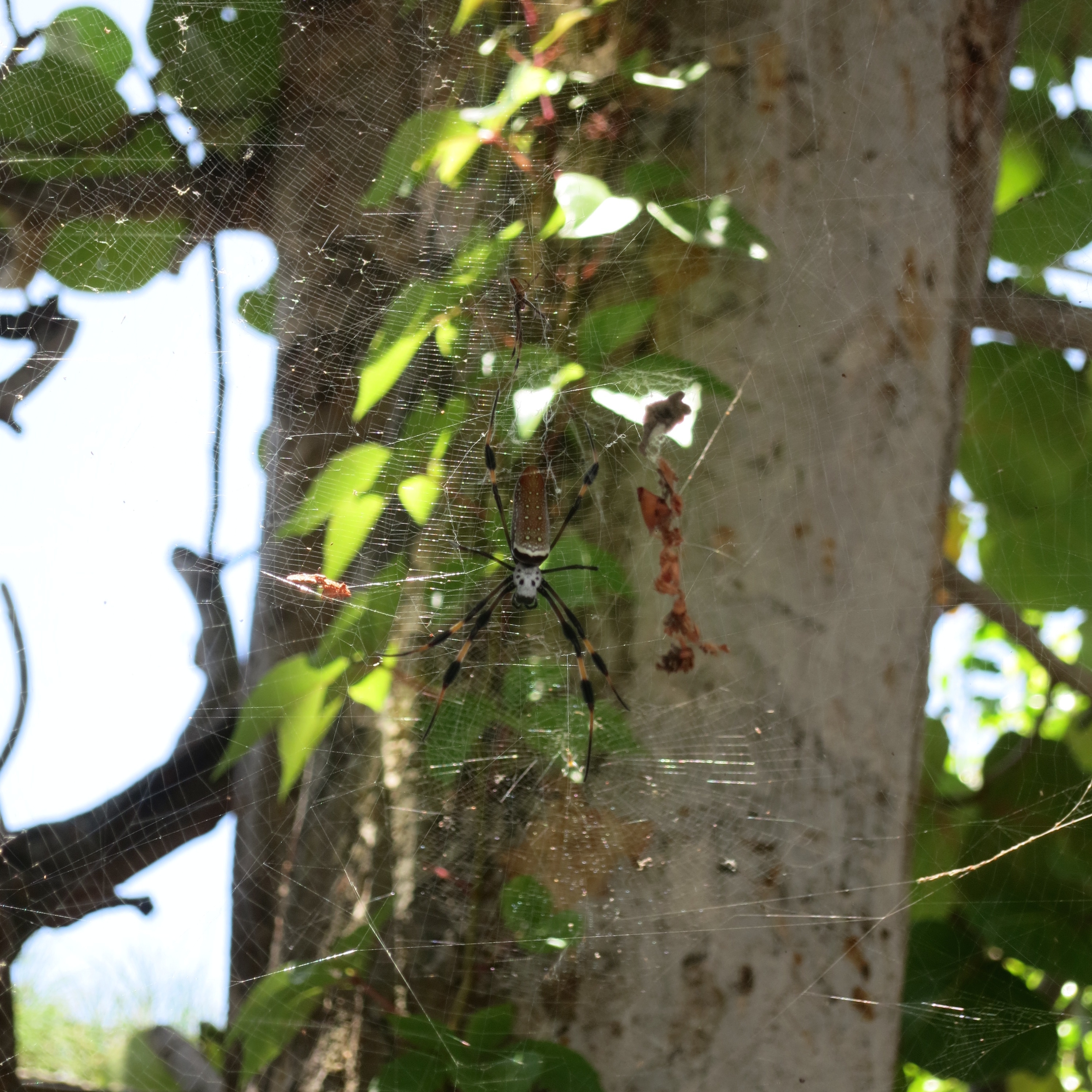 These are banana spiders, or golden silk orb-weavers. They are harmless and large (the big one here was 5 inches across including legs.) The webs have a yellow hue.