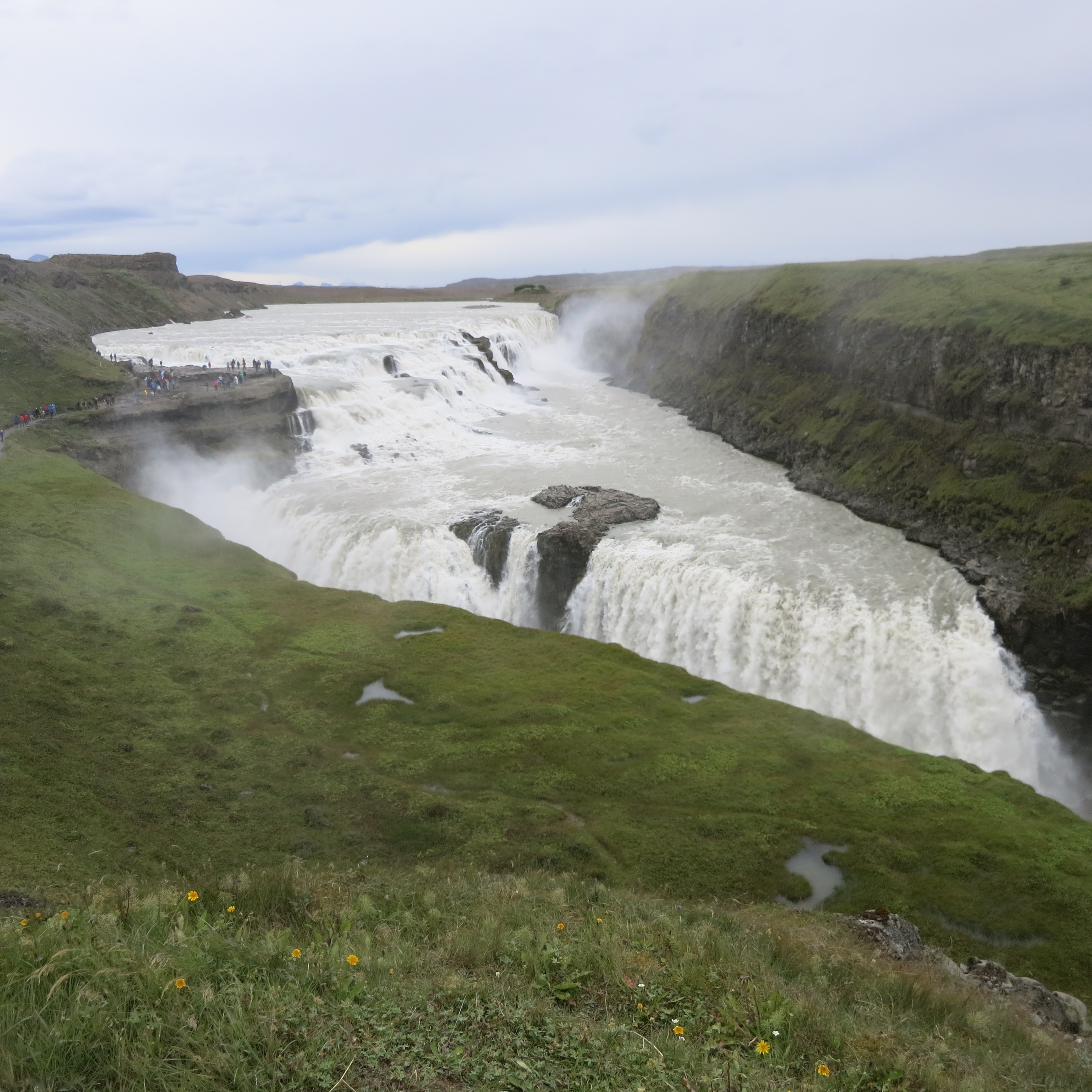 Gullfoss Falls. We were told in spring floods, water can cover where the tourists are standing and fill the lower canyon.