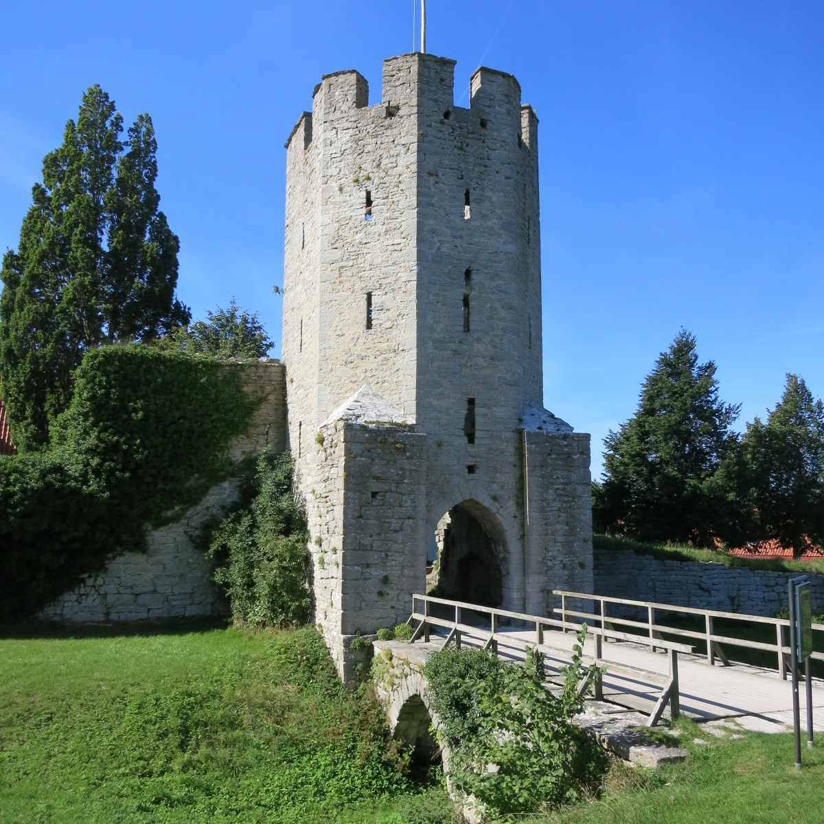 IMG_4800 Published September 7, 2014 at 2992 × 2992 in Sweden continued ← Previous Next → One of the tower entrances to Visby, Gotland. While there is not a traditional moat around the town, there is a low wet area. The wooden planks that make up this bridge would be removed when the town was expecting intruders.