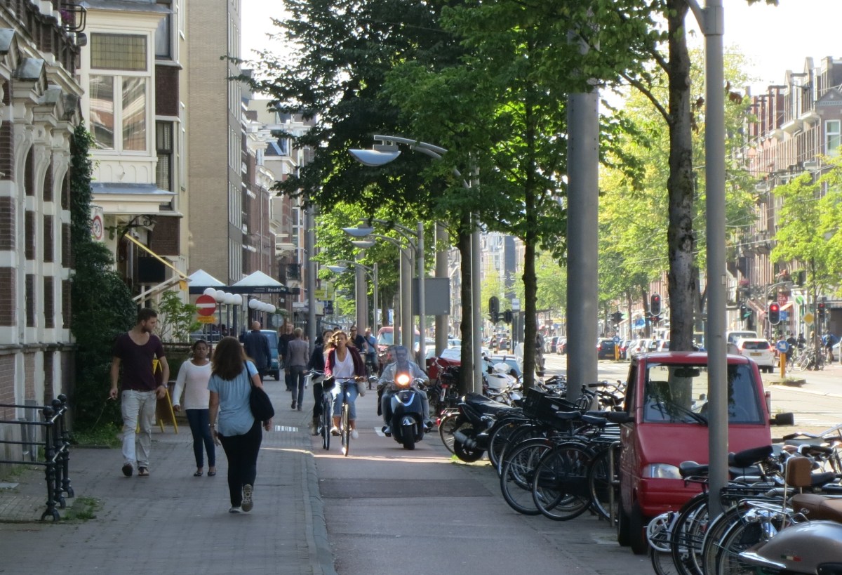 IMG_5358 Published September 23, 2014 at 2366 × 1616 in Amsterdam ← Previous Next → A typical street scene: scooter passing bikes in the cycle lane, a miniature car parked in the bike parking, the rest of motor traffic in the middle, and pedestrians up against the buildings.
