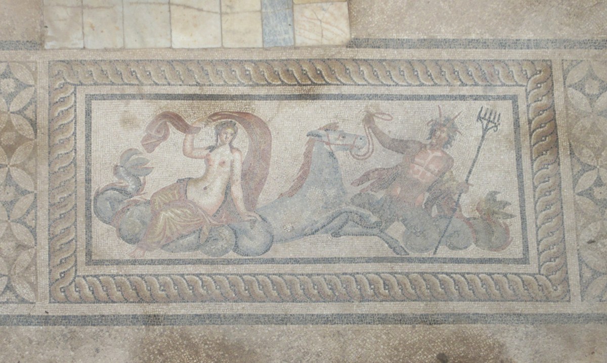 IMG_2107 Published December 26, 2014 at 4033 × 2416 in Ephesus ← Previous Next → Floor mosaic of a woman riding a hippocampus, mythical Roman beast, and a god.