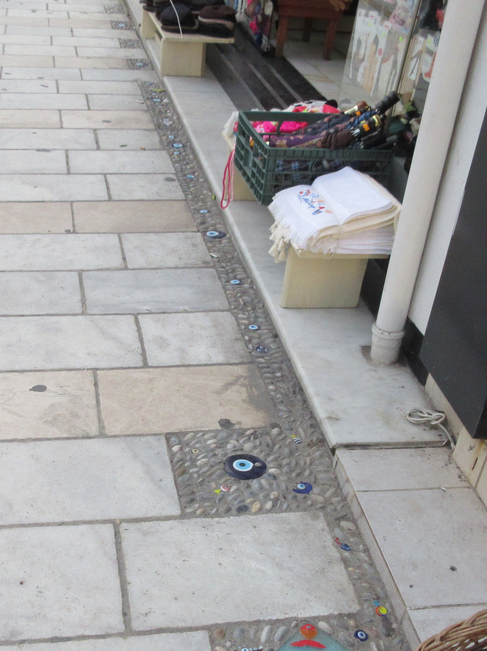The blue eye amulets, called nazar, are everywhere and often built into walls and sidewalks. It is believed to provide protection from the Evil Eye and likely dates back to the 16th century BC when glasswork developed.