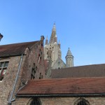 - One of the beautiful spires in Bruges peaks over closer rooflines.